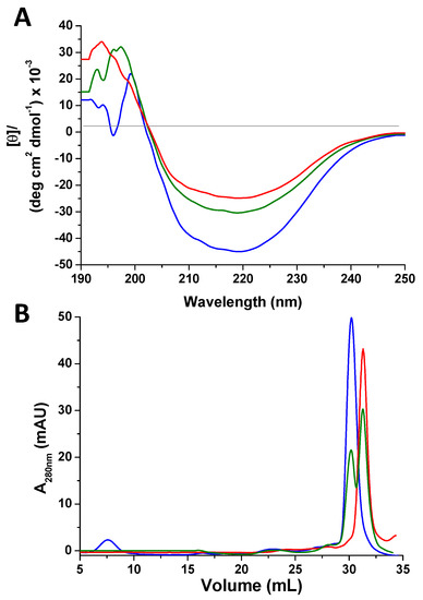 (A) Far-UV circular dichroism spectra in 25 mM phosphate buffer (pH 7.0) of apoAtox1 in the reduced form (blue) and after 1 h (green) and 12 h (red) incubation with three equivalents of GSSG, plotted as the mean residue molar ellipticity, [θ]. (B) Analysis by size-exclusion chromatography (SEC) of apoAtox1 in the reduced form (blue) and after 1 h (green) and 12 h (red) incubation with three equivalents of GSSG. The chromatography was carried out on a Superdex 75 Increase 10/300 column (GE Healthcare, column volume 24 mL) using 20 mM ammonium acetate (pH 6.5) at a flow rate of 0.5 mL min−1. The volume of protein solution injected was 0.5 mL for each run.