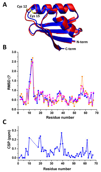 The final crystal structure (Rwork, 0.247, Rfree 0.268) is shown in Figure 4A. The distance between the S atoms of Cys12 and Cys15, which was 4.02 Å for the MR model, is 2.04 Å for oxidized Atox1. A clear electron density bump is present close to His46, in a region occupied by a water molecule or a sulfate ion in other Atox1 crystal structures, and it has been modeled with a water molecule. In Figure 4B, it is reported the residue-by-residue root-mean-square deviation (RMSD) between Cα atoms of oxidized Atox1 and other known human Atox1 crystal structures, namely that of the monomer (PDB ID 3iwl) [31] and of the homodimer (PDB ID 4qot) [32]. Main deviations, up to 2 Å, reside in the metal-binding region, comprised between Met10 and Cys15, where a Pt(II) ion is hosted in 3iwl and 4qot. Other residues having large deviations, which are above 1 Å for the homodimer, are Lys56 and Lys57, belonging to a lysine-rich region (KKTGK) located in the loop α2β4. This region is the nuclear localization signal for the translocation of Atox1 to the nucleus and plays a key role in the formation of the Atox1 dimer, representing a large portion of the intermolecular interaction surface. Notably, the plot of the RMSD values of the Atox1 crystal structures shows similarities with the backbone chemical shift perturbation (CSP) analysis (Figure 4C), pointing at similar conformational changes between oxidized and reduced Atox1 in solution and in the solid state.