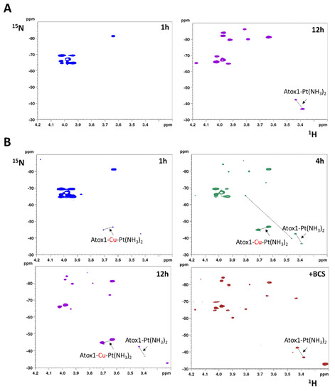 We previously demonstrated that apoAtox1 is unable to bind cisplatin in excess of GSH [34]. Remarkably, preloading with Cu(I) enhances the reactivity of Atox1 toward cisplatin notwithstanding the presence of GSH [34,35]. The reaction of 15N-labeled cisplatin with Cu(I)-Atox1 (70 μM) was carried out in the presence of 210 μM GSH. After 1 h incubation, two cross-peaks corresponding to 15N trans to S (δ 15N = −44.8 and −46.6 ppm) are detected (Figure 5B). After 4 h, in addition to these signals, which are downfield-shifted along the 1H dimension, the cross-peaks of Atox1-Pt(15NH3)2 [34] are observed along with those of the monodentate adduct of 15N-labeled cisplatin with reduced glutathione (δ 15N = −65.1 and −39.7 ppm, for 15NH3 ligand trans to Cl and trans to S, respectively) [36]. After 12 h, the cross-peaks of [PtCl(15NH3)2(GS)] disappear and those of Atox1-Pt(15NH3)2 become barely detectable, whereas the downfield signals show higher intensity. At this incubation time, addition of 210 µM bathocuproine disulfonate (BCS, a ligand which binds specifically Cu(I) with high affinity) [37] causes the immediate disappearance of the downfield signals and the increase of the Atox1-Pt(15NH3)2 cross-peaks, indicating that the downfield signals belong to a species of the type Atox1-Cu-Pt(15NH3)2 containing a Cu-Pt core (Figure 5B). These results indicate that Cu(I)-Atox1 favorably competes with GSH for binding to cisplatin.
