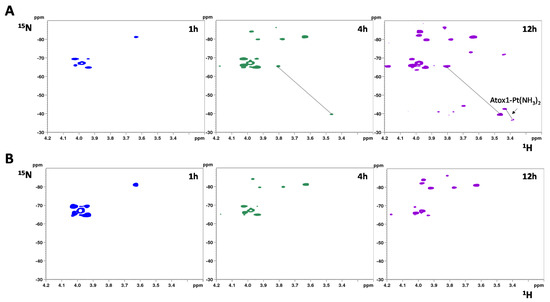 When 15N-labeled cisplatin is incubated for 12 h with one equivalent of reduced apoAtox1 (70 μM), in addition to the cross-peaks of the dichloro (cis-[PtCl2(15NH3)2], δ 15N = 67 ppm) and the monochloro monoaqua species (cis-[PtCl(15(NH3)2(H2O)]+, δ 15N = −65 and −88 ppm for the 15NH3 ligand trans to Cl and trans to O, respectively), two cross-peaks appear in the 1H,15N-HSQC spectrum in the region of 15NH3 trans to S (δ 15N = −42.5 and −36.5 ppm), corresponding to the bidentate adduct Atox1-Pt(15NH3)2, with both cysteines of the CxxC motif of Atox1 replacing the chlorido ligands of cisplatin (Figure 5A) [34].