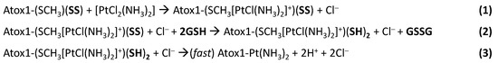In our proposed mechanism, the Pt-containing species present in solution (i.e., intact cisplatin and its hydrolyzed forms) first interact with a methionine residue of oxidized Atox1, and when reduction is accomplished by GSH, Pt(II) binding stabilizes the reduced form, thus increasing the redox potential and shifting the reaction to the right (Scheme 1).
