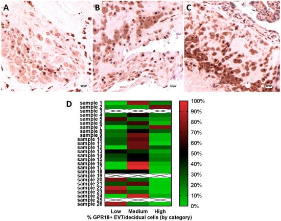 GPR-18 expression in placental extravillous trophoblasts (EVT). Low (A), medium (B) and high (C) expression of GPR-18 in vascular smooth muscle cells of human term placenta. The images shown are representative, n = 23. Scale bars represent 50 µm. (D) Distribution of low/medium/high GPR18 expression in extravillous trophoblasts and decidual cells across each placental sample.
