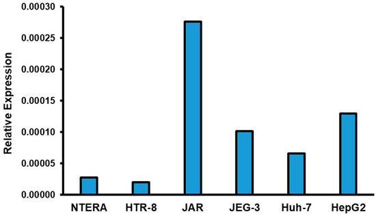 This is to our knowledge the first identification of GPR18 protein expression in placental tissue. To verify expression was not artifactual, we assessed the transcript-level gene expression of GPR18 in placental cell lines, including normal human immortalized placental trophoblasts (HTR-8), and in choriocarcinoma-derived placental trophoblasts (JEG-3 and JAR cells). As shown in Figure 3, we identified variability in expression of GPR18 across the cell lines with highest expression in the JAR cell line, which exhibited approximately 5 to 6-fold increased transcript level expression over NTERA (human testicular-derived cell line) and Huh-7 (human hepatocellular carcinoma) and ~2-fold increase over the HepG2 (human hepatocellular carcinomas) cell line. These findings provide transcript-level confirmation of GPR18 in placental cells that support our protein-level expression findings. Further, we also observed increased GPR18 expression in choriocarcinoma-derived cells compared to human immortalized cells (Figure 3).