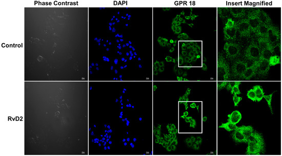 Resolvin D2 (7(S), 16(R), 17(S)-Resolvin D2, # 10007279) was purchased from Cayman Chemical (Ann Arbor, MI, USA). LPS was purchased from Sigma-Aldrich (St. Louis, MO, USA). TRIzol reagent and random hexamers were obtained from Invitrogen (Waltham, MA, USA). Protease inhibitor cocktail and SYBR Green master mix was purchased from Roche, Indianapolis, IN, USA. Anti-GPR 18 antibody were obtained from Invitrogen, (# PA5-23218) and HRP-conjugated secondary antibody were from Jackson Immuno Research, West Grove, PA, USA.