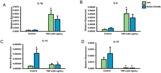 Effect of RvD2 on pro-inflammatory IL-1β and IL-6 transcriptional expression. Total RNA was isolated from placental trophoblasts with and without 100 nM of RvD2 and TNFα (60 ng/mL) treatment and IL-1β (A), IL-6 (B), IL-10 (C) and IL-18 (D) mRNA expression were measured relative to 18S control RNA. Data are mean ± standard deviation, n = 4 experiment. * p < 0.05 compared to unstimulated, vehicle-treated (no TNFα/RvD2) cells; statistical comparison by ANOVA with post hoc Bonferroni correction.