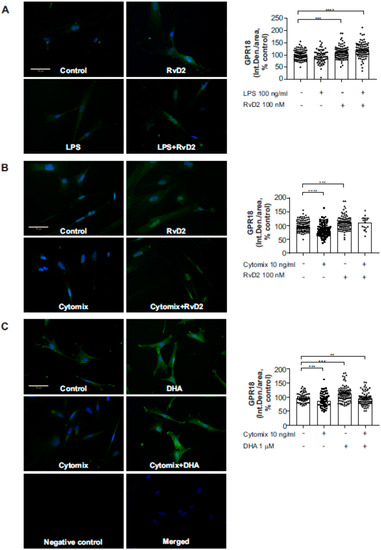 Protein expression of GPR18 upon treatment with resolvin D2. HUASMC were pretreated with RvD2 (A,B) or DHA (C) at indicated concentrations, and then stimulated with LPS (100 ng/mL) (A) or cytomix (IL1β, TNFα, IFNγ) (B,C) for 24 h. At the end of each experiment, cells were fixed and stained for GPR18. Quantification of the immunofluorescent data was performed using ImageJ (A–C, right panels). Data are median with 95% CI, n = 3 experiments except for n = 4–5 experiments for control and cytomix treatments on panel C. Data are median with 95% CI, * indicates p < 0.05, ** p < 0.01, *** p < 0.001, **** p < 0.0001. Scale bars represent 70 µm.
