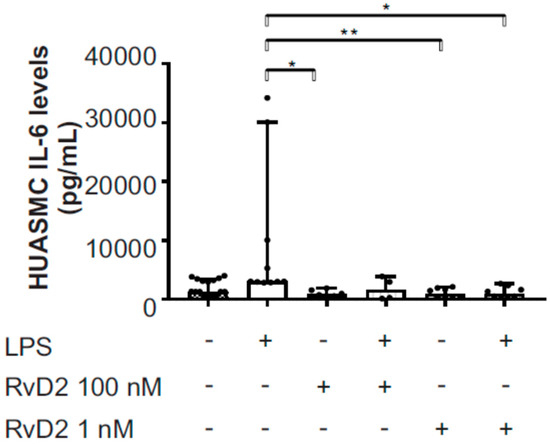 Effects of RvD2 treatment on HUASMC inflammatory cytokine production following LPS treatment. Following one-hour pretreatment with RvD2 at indicated concentrations, HUASMC cells were treated with LPS (100 ng/mL), and IL-6 levels were measured using an ELISA kit after 24 h. Data are from three separate experiments and data are median with 95% CI, * indicates p < 0.05, ** p < 0.01.