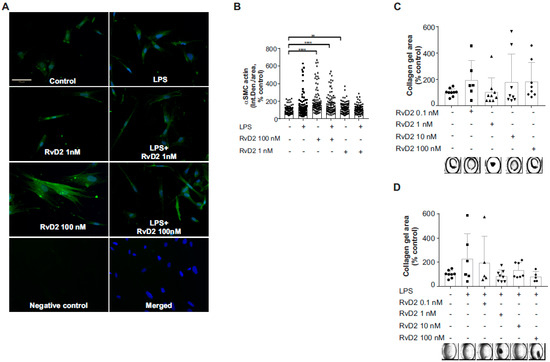 Effects of RvD2 on cytoskeletal changes in HUASMC. (A) Immunofluorescent staining for αSMA is shown. HUASMC cells grown on glass coverslips were pretreated for one hour with RvD2 at indicated concentrations, and then stimulated with LPS (100 ng/mL) for 24 h. At the end of each experiment, cells were fixed and stained for α-SMA. Representative images at 20× magnification are shown. Scale bar represents 70 µm. (B) Quantification of the immunofluorescent data using ImageJ is shown. Data are from three separate experiments, median with 95% CI. ** indicates p < 0.01, **** p < 0.0001. (C,D) Collagen gel contraction assay is shown as % of control. HUASMC cells were grown at 30 × 104 cells/mL concentration in collagen gel mixture, and then pretreated with RvD2 and stimulated with LPS for 24 h. A total of nine images were obtained for each well, and one combined image was obtained using Keyence Image Stitching Module. Representative images for each well are shown. Data are mean ± standard deviation, n = 4–5 experiments.