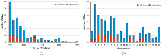 We obtained CNV profile for 22 autosomes from 5018 pregnant women (Figure 1). Together, we identified 225 CNVs ranging from 600 kbp to 7820 kbp with median size 820 kbp (Table S1). These variants include 178 duplications (79.11%) and 47 deletions (20.89%) with median size 830 kbp for duplications and 800 kbp for deletions. As can be seen, the majority of identified CNVs were approximately 600–700 kbp long (Figure 2a). Most variants (28) were found on the chromosome 2, while on the chromosome 15 we detected only one variant. We did not identify any deletions on chromosomes 11, 15, 20, and 22 (Figure 2b). The identified CNVs came from 212 individuals, corresponding to frequency 4.2% of CNV ≥ 600 kbp in our cohort. The vast majority of individuals (95.28%) displayed a single CNV; only 4.72% exhibited more than one variant. The most frequently detected variant was the CNV duplication in chromosome location 2p22 with a total of 11 detection events; however, the frequency of every CNV was calculated as less than 1%, thus all variants were considered to be rare. The largest CNV was duplication spanning 7820 kbp in chromosome location 10q21.1.