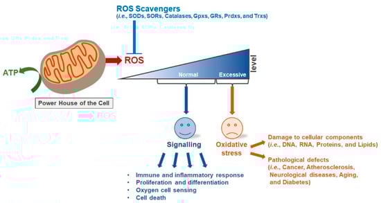 Therefore, ROS homeostasis is essential for steady state functions of cells [,]. The accumulation of ROS resulting from any imbalance in ROS production and metabolism induces oxidative stress []. In other words, oxidative stress is the result of imbalance between two opposite and opposing forces, i.e., ROS production and antioxidation, and it can lead to pathological defects in living organisms, such as cancer, atherosclerosis, neurological diseases, aging, and diabetes, as well as can harm the cellular components, such as DNA, RNA, lipids, and proteins [,]. To protect cells from the oxidative stress, there are many enzymatic and non-enzymatic defense systems in mitochondria [,]. The non-enzymatic defense system includes flavonoids, vitamins (A, C, and E), and glutathione []. Superoxide dismutase (SOD), superoxide reductase, catalase, glutathione peroxidase, glutathione reductase, peroxiredoxins (Prdxs), and thioredoxins (Trx) are important enzymatic antioxidants that are involved in the regulation of mitochondrial ROS [,]. ROS production in mitochondria and their subsequent fate involve interactions between various molecules in normal and pathological conditions [] (Figure 1).