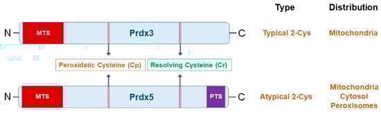 Structural comparison of mitochondrial peroxiredoxins (Prdxs). Peroxiredoxin 3 (Prdx3) and Peroxiredoxin 5 (Prdx5) contain a mitochondrial targeting sequence (MTS) at their amino terminal (N-terminal) and this enables them to reside in the mitochondria. Prdx5 in addition to MTS also contains a peroxisomal targeting sequence (PTS) at its carboxyl terminal (C-terminal) that is responsible for the entry of Prdx5 in the peroxisomes. Both mitochondrial Prdxs comprise peroxidatic cysteine (Cp) and resolving cysteine (Cr) which play an essential role in their catalytic mechanisms. In Prdx3, Cp is located at residue 47, whereas, in Prdx5, it is located at residue 48 [].