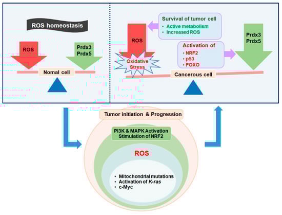 Role of antioxidants in cancerous cells. Mutations in mitochondria and mitochondrial dysfunctions lead to the production of increased amount of ROS by the activation of c-Myc and K-ras factors. The increased production of ROS leads to an imbalance between ROS and its scavengers. This imbalance activates a number of signaling pathways such as PI3K and mitogen-activated protein kinase (MAPK), resulting in tumor initiation and progression. The increased amount of ROS in cancerous cells requires an upregulated expression of antioxidants to prevent cell death. Thus, the activation of certain transcription factors (NRF2 and FOXO) and tumor suppressors (p53) induces the upregulation of mitochondrial Prdxs to compensate the increased production of ROS. Thus, mitochondrial Prdxs along with other scavengers act to protect the cancerous cells from ROS-mediated cell death.