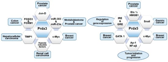 Our survey of studies analyzing the involvement of mitochondrial Prdxs in human cancers shows that most of the conducted studies are based on the expression analysis of Prdx3 and Prdx5. It is depicted that mitochondrial Prdxs are upregulated in variety of cancer types and directly or indirectly regulated by transcription factors, microRNAs, and oncogenes. Further, the interaction of Prdx5 with response elements is also reported, but current studies for analyzing the roles of mitochondrial Prdxs and ROS in cancer need more in depth analyses, as described below