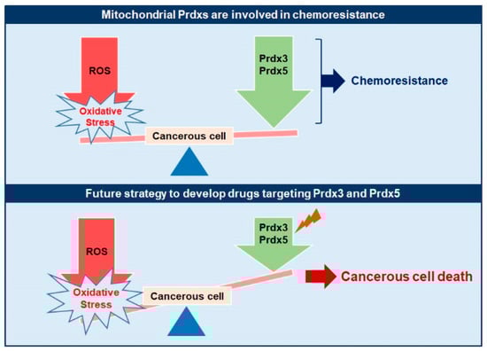 Mitochondrial Prdxs in development of Chemoresistance. The upregulated expression of mitochondrial Prdxs is associated with the development of drug resistance in a number of cancer types leading to complications in cancer treatment. These upregulated Prdxs can be specifically targeted in cancerous cells to develop new drugs against cancer with better efficacy and without causing any harm to the normal cells.