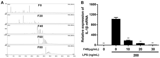 (A) HPLC characterization of the five fractions. A total of 10 μL each sample (1 mg/mL) was injected and analyzed using a Dionex UltiMateTM 3000 HPLC system with photodiode array detection (PAD) at 259 nm. A Symmetrix ODS-RC18 (25 × 4.6 mm, 5 mm) HPLC column protected with a Phenomenex security guard column (C18, 4 × 3.0 mm) operated at 30 °C was used, and the flow rate was maintained at 1 mL/min. The elution solvents were acetonitrile (a) and 0.1% acetic acid (b). Samples were eluted according to the following gradient: 0–35 min 30% a isocratic, 35–45 min 30% to 40% a, 45–55 min 40% a isocratic, and finally washing and recondition of the column. (B) Relative expression of IL-1β mRNA after treatment with F40. RAW264.7 cells were pretreated with different concentration of F40 for 1 h and then treated with 200 ng/mL LPS for 6 h. Total RNA was extracted and genes expression level were analyzed by RT-PCR in triplicate. The expression level of each gene was normalized to glyceraldehyde-3-phosphate dehydrogenase (GAPDH) mRNA. Data are expressed as mean ± SD (n = 6). ** p < 0.01 vs. LPS treatment group.