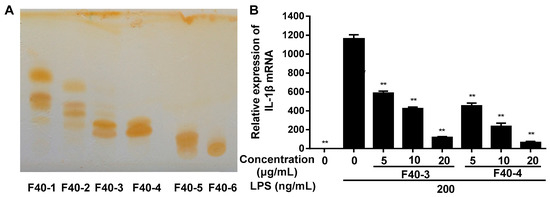 (A) Sub-fractions separated from F40 by silica gel chromatography. TLC was performed on precoated silica gel 60 F254 plates (Qingdao Haiyang Chemical Co., Ltd., Qingdao, China), developed with chloroform-methanol (4:0.1, V/V) and then exposed to the iodine vapor in a dark enclosed chamber for 10 min. (B) The relative expression of IL-1β mRNA after treatment with sub-fractions of F40-3 and F40-4. RAW264.7 cells were pretreated with different concentration of different sub-fractions of F40 for 1 h, then treated with 200 ng/mL LPS for 6 h. Total RNA was extracted and genes expression levels were analyzed by RT-PCR in triplicate. The expression level of each gene was normalized to GAPDH mRNA. Data are expressed as mean ±SD (n = 6). ** p < 0.01 vs. LPS treatment group.