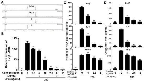 (A) HPLC characterization of the sub-fractions F40-3, F40-4 and two purified compounds. 10 μL each sample (0.1 mg/mL) was injected and analyzed using a Dionex UltiMateTM 3000 HPLC system with PAD at 193 nm. A Symmetrix ODS-RC18 (25 × 4.6 mm, 5 mm) HPLC column protected with a Phenomenex security guard column (C18, 4 × 3.0 mm) operated at 30 °C was used, and the flow rate was maintained at 1 mL/min. The elution solvents were acetonitrile (a) and 0.1% acetic acid (b). Samples were eluted according to the following gradient: 0–5 min 10% to 35% a, 5–12 min 35% a isocratic, 12–16 min 35% to 45% a, 16–22 min 45% a isocratic, 22–35 min 45% to 80% a, and finally washing and recondition of the column. (B) The relative expression of IL-1β mRNA treated by active compounds. (C) Inhibitory effect of coelonin on LPS-induced gene expression in RAW264.7 macrophages. RAW264.7 cells were pretreated with different concentration of compound I or II for 1 h, then stimulated with 200 ng/mL of LPS for 6 h. Total RNA was extracted and genes expression level were analyzed by RT-PCR in triplicate. (D) Inhibitory effect of coelonin on LPS-induced cytokine secretion in RAW264.7 macrophages. RAW264.7 cells were pretreated with coelonin for 1 h and then treated with 200 ng/mL LPS. 12 h after LPS stimulation, culture supernatants was collected for IL-6 and TNF-α detection by cytometric bead array (CBA) method; for IL-1β detection, the remaining cells were following treated by 1 mM adenosine triphosphate (ATP) for an additional 15 min at 37 °C [18], then supernatants were collected and analyzed by the CBA method in triplicate. Data are expressed as mean ± SD (n = 6). ** p < 0.01 vs. LPS treatment group.