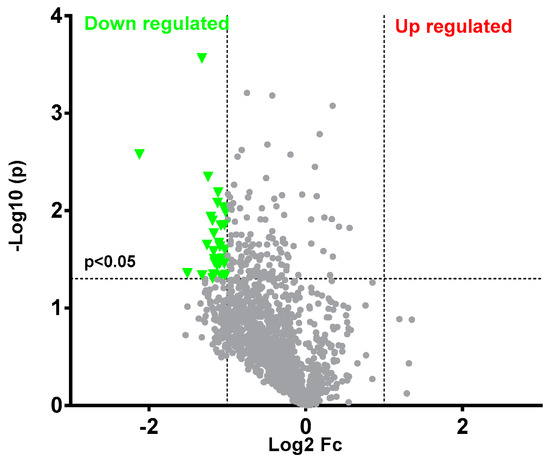 Protein and phosphorylation altered after coelonin treatment. From a total of 1318 differentially phosphorylated proteins, 32 were selected as significantly downregulated by coelonin using a volcano plot analysis.