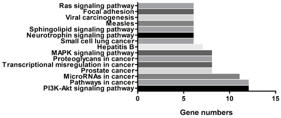 Moreover, we entered the ENTREZ Gene IDs of the 32 genes into the DAVID Bioinformatics Resources 6.8 database. As depicted in Figure 5, the numbers of changed genes in the PI3K/AKT signaling pathway, the mitogen-activated protein kinase (MAPK) signaling pathway, the neurotrophin signaling pathway, the Sphingolipid signaling pathway and Ras signaling pathway were ranked in the top 15. In addition, we found that within these genes, the maximum number of genes belonged to the PI3K/AKT signal pathway. It is noteworthy that the phosphorylation of both subunits p65 and p105/50 of transcription factor NF-κB in this signaling pathway was reduced, which was closely related to the regulation of inflammatory gene expression [21].