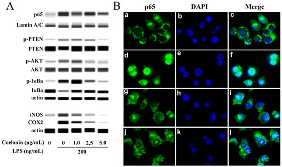 RAW264.7 cells were grown on glass coverslips. After the treatment with LPS (200 ng/mL) with or without pre-treatment with coelonin or NF-κB-inhibitor APDC, cells were fixed with 4% formalin in PBS for 20 min at room temperature, permeabilized with 0.1% Triton X-100 for 15 min, and nonspecific protein binding sites were blocked with 10% FBS at room temperature for 1 h. Then samples were incubated overnight at 4 °C with a p65 (ab32536, Abcam, Cambridge, MA, USA) specific Antibody (1:100 dilution in PBS), washed three times with PBS, and then incubated with a Alexa Fluor® 488-labeled secondary antibody (ab60314, Abcam; 1:600 dilution in PBS) for 2 h at room temperature. The coverslips were rinsed three times with PBS, then stained with 4′,6-diamidino-2-phenylindole (DAPI) for 10 min. Again, the coverslips were rinsed with PBS three times and then mounted on glass slides using Antifluorescence Quenching Sealing Solution. The coverslips were analyzed by confocal microscopy (LSM880; ZEISS, Upper Cohen, Germany).