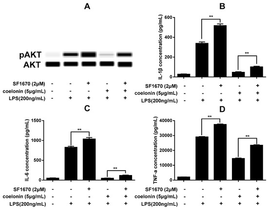 (A) Western blotting result of pAKT. RAW264.7 cells were incubated with solvent or 200 ng/mL LPS for 30 min in the absence or presence 5 μg/mL of coelonin or 2 μM of the PTEN inhibitor SF1670 or 2 μM of SF1670 combined with 5 μg/mL of coelonin. Then total cellular protein was extracted and analyzed by a simple western immunoblotting technique on a Peggy Sue system. (B–D) Effect of PTEN inhibitor SF1670 on anti-inflammatory activity of coelonin. RAW264.7 cells were incubated with solvent or 200 ng/mL LPS for 12 h in the absence or presence 2 μM of the PTEN inhibitor SF1670 or 5 μg/mL of coelonin or 2 μM of SF1670 combined with 5 μg/mL of coelonin. Culture supernatants was collected for IL-1β, IL-6 and TNF-α detection by CBA method. Data are expressed as mean ± SD (n = 6). ** p < 0.01.
