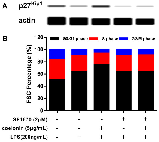 The PI3K-Akt pathway has been shown be involved in a variety of cellular processes, including inflammation response [27], cell survival and proliferation [32]. Many reports indicate that the PI3K/AKT pathway plays a pivotal role in regulating cell cycle progression through phosphorylation and degradation of cell cycle regulator p27Kip1 [33,34]. P27Kip1 can interact with cyclin-dependent kinase 2 (CDK2) and cyclinE to prevent cell entry into the S phase, and over-expression p27Kip1 would promote cell G1 phase cell cycle arrest [35]. In many cancer cells, such as cervical cancer cells, oral squamous cell carcinoma cells, and prostatic carcinoma cells, the expression protein of p27Kip1 was significantly reduced, the invasion and migration ability was enhanced, and the expression of p27Kip1 was negatively correlated with survival [33,36]. We noticed that the microarray results showed that coelonin significantly down regulated the phosphorylation of p27kip1, and interestingly, a previous study indicated that the up-regulation of PTEN prevents p27Kip1 phosphorylation and proteolysis [37]. Hence, we speculate that coelonin may inhibit p27Kip1 phosphorylation and degradation mediated by PTEN. Western blot confirmed that 5 μg/mL coelonin treatment significantly recovered the p27Kip1 level, which was even higher than the un-treatment group, while LPS stimulation significantly reduced the p27Kip1 level, and PTEN inhibitor SF1670 almost completely abrogated the effect of coelonin (see Figure 8A). Theoretically, high levels of p27Kip1 can block cells in the G1 phase cell-cycle, so we used flow cytometry to verify whether coelonin could induce G1 phase cell cycle arrest in RAW264.7 cells. As observed in Figure 8B, coelonin pre-treatment remarkably induced G1 phase cell cycle arrest and SF1670 completely inhibited the effect of coelonin. These data suggest that coelonin inhibits p27Kip1 degradation in a PTEN-dependent manner, thereby exerting its G1 phase cell cycle arrest effect in RAW264.7 cells.