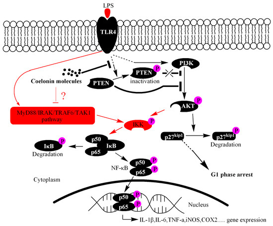 Proposed mechanism of coelonin inhibiting LPS-stimulated activation of NF-κB and inducing G1 phase cell-cycle arrest in RAW264.7 cells. Coelonin inhibits the expression of inflammatory cytokines IL-1β, IL-6 and TNF-α in RAW264.7 cells treated by LPS may partially through the PTEN/AKT pathway. However, it induces G1 cell cycle arrest of RAW264.7 cells by inhibiting the degradation of p27Kip1 in a PTEN-dependent manner. The black arrow section has been verified, while the red arrow section needs further validation. The question mark indicated that coelonin may inactivate NF-κB by inhibiting TLR4/MyD88/TRAF6/TAK1 signal pathway, the canonical pathway of NF-κB activation.