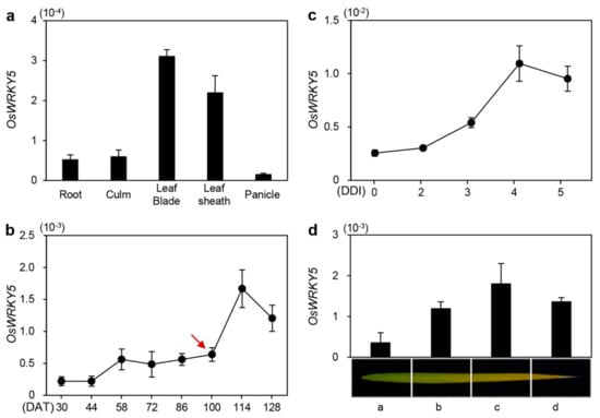 To examine the spatial expression of OsWRKY5, we investigated transcript levels of OsWRKY5 in rice organs including root, culm, leaf blade, leaf sheath, and panicle at the reproductive stage (Figure 1a). OsWRKY5 was preferentially expressed in the leaf blade and leaf sheath. Previous transcriptome analysis [] showed upregulation of 47 rice WRKY TFs including OsWRKY5 in flag leaves during natural senescence (NS). Therefore, we determined age-dependent changes in OsWRKY5 expression in flag leaves of wild-type (WT; japonica cultivar ‘Dongjin’) rice grown in a paddy field under natural long-day (NLD) conditions (>14 h light/day). While OsWRKY5 was constitutively expressed in developing leaves at the vegetative stage, OsWRKY5 expression was dramatically upregulated in senescing leaves at the reproductive stage (Figure 1b). In addition, OsWRKY5 expression gradually increased in detached leaves of four-week-old WT leaves during DIS (Figure 1c). We further found that OsWRKY5 transcripts accumulated in the yellowing sector (region c) more than in the green sector (region a) of senescing flag leaves (Figure 1d). These results suggest that OsWRKY5 is involved in the onset and progression of leaf senescence in rice.