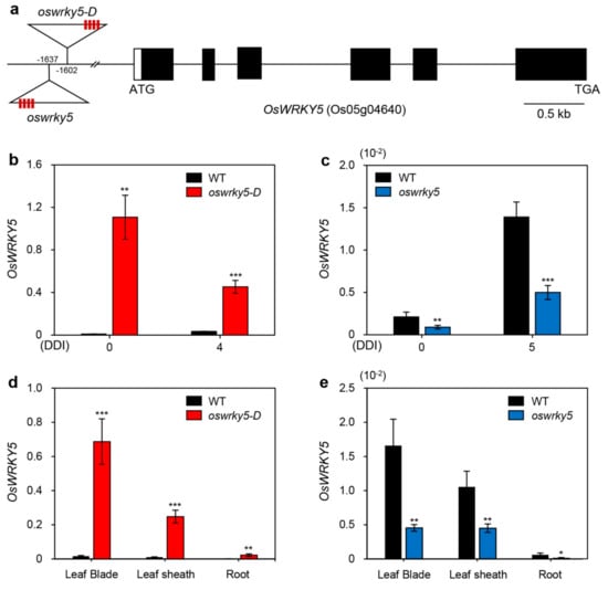 Mutation of OsWRKY5 by T-DNA insertion. (a) Schematic diagram depicting the positions of T-DNA insertions in the promoter region of OsWRKY5 (LOC_Os05g04640). Black and white bars represent exons and 5′-untranslated region, respectively. Open triangles indicate the location of the OsWRKY5 T-DNA insertions (oswrky5-D, PFG_3A-15928; oswrky5, PFG_3A-06060). Red boxes on triangles represent tetramerized 35S enhancers (4 × 35S). (b,c) Total RNA was isolated from detached leaves of WT and mutant lines (oswrky5-D and oswrky5) under DIS as shown in Figure 3a,b. (d,e) OsWRKY5 mRNA levels were measured in rice tissues separated from three-week-old WT and mutant lines. Transcript levels of OsWRKY5 in oswrky5-D (b,d) and oswrky5 (c,e) were determined by RT-qPCR and normalized to the transcript levels of OsUBQ5. Mean and SD values were obtained from more than three biological replicates. Asterisks indicate a statistically significant difference from WT, as determined by Student’s t-test (* p < 0.05, ** p < 0.01, *** p < 0.001). DDI, day(s) of dark incubation.