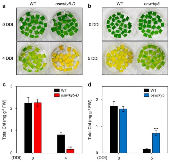 To determine the phenotypic difference between WT and mutant lines during DIS, we next incubated detached leaves of three-week-old WT, oswrky5-D, and oswrky5 plants in 3 mM MES buffer (pH 5.8) at 28 °C under complete darkness. While oswrky5-D showed accelerated leaf yellowing compared with the WT, the oswrky5 leaves retained their green color longer than the WT leaves (Figure 3a,b). Consistent with the leaf color, the total chlorophyll content of oswrky5-D was less than that of the WT after DIS, whereas oswrky5 maintained higher total chlorophyll levels during DIS compared with the WT (Figure 3c,d).