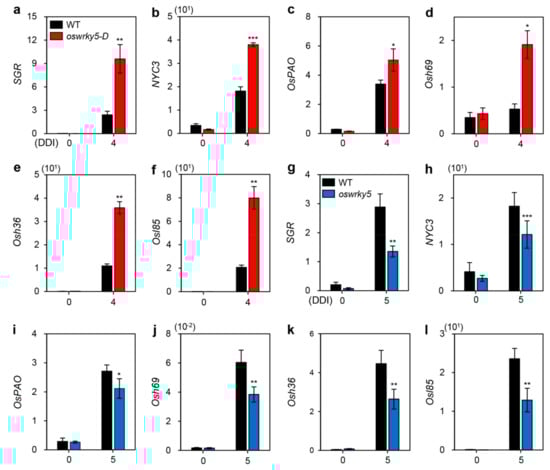 In senescing leaves, chlorophylls are sequentially degraded by chlorophyll-degrading enzymes associated with upregulation of CDGs, including SGR [], NYC3 [], and OsPAO []. Many other SAGs are also upregulated during DIS in rice, with products identified as seed imbibition protein (Osh69), glyoxylate aminotransferase (Osh36), and isocitrate lyase (Osl85) []. We therefore measured transcript levels of CDGs and SAGs in detached leaves of three-week-old WT, oswrky5-D, and oswrky5 plants under DIS conditions as shown in Figure 2. RT-qPCR analysis revealed that expression of CDGs and SAGs was upregulated in oswrky5-D after 4 days of dark incubation (DDI) (Figure 4a–f) but downregulated in oswrky5 after 5 DDI when compared with the WT (Figure 4g–l). These results demonstrate that OsWRKY5 promotes the onset and progression of leaf senescence by upregulating expression of CDGs and SAGs.