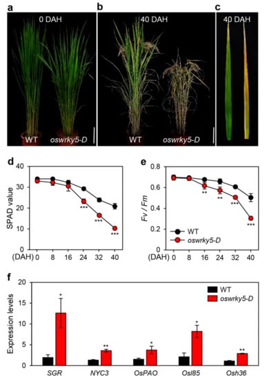 To further examine how OsWRKY5 overexpression affects leaf senescence during vegetative and reproductive stages, we monitored age-dependent leaf yellowing in WT and oswrky5-D plants grown under NLD conditions (>14 h daylight) in the field (37° N latitude, Suwon, South Korea). While there was no significant difference in leaf color between the WT and oswrky5-D until heading (Figure 5a), the leaves of oswrky5-D showed a precocious leaf senescence phenotype at 40 days after heading (DAH) (Figure 5b,c). The SPAD value, a parameter for leaf greenness, indicated lower levels of green pigments in flag leaves of oswrky5-D compared with the WT at 24 DAH (Figure 5d). Leaf greenness is closely linked to photosynthetic capacity [,]. Thus, reduced SPAD value led to a relatively lower Fv/Fm ratio (efficiency of photosystem II) in oswrky5-D than in WT at 24 DAH (Figure 5e). Similar to expression patterns of CDGs and SAGs during DIS, CDG and SAG transcripts were more abundant in the senescing flag leaves of oswrky5-D than in those of WT at 40 DAH (Figure 5f). These results indicate that OsWRKY5 acts as a positive regulator of leaf senescence during both NS and DIS.