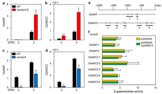 WRKY TFs regulate the transcription of their target genes by recognizing a consensus cis-element, the so-called W-box []. The W-box has been generally defined as 5′-TTGAC(C/T)-3′ with an invariant TGAC core sequence essential for WRKY binding [,]. Since repetitive TGAC sequences enhance WRKY binding efficiency, we searched for the TGAC core sequence within 2 kb upstream of the transcriptional initiation sites of OsNAP and OsNAC2, and found two regions (‒1001 ~ ‒765 and ‒657 ~ ‒575) in the promoter of OsNAP and five regions (‒1760 ~ ‒1574, ‒1411 ~ ‒1309, ‒1135 ~ ‒1021, ‒660 ~ ‒480, and ‒352 ~ ‒98) in the promoter of OsNAC2 (Figure 6e). To investigate whether the OsWRKY5 TF directly binds to the promoters of OsNAP and OsNAC2, we performed yeast one-hybrid assays. However, we could not find any difference between GAL4AD and GAL4AD-OsWRKY5 by measuring β-galactosidase activity of lacZ reporter genes, indicating that OsWRKY5 seems not to interact with the promoter of OsNAP or OsNAC2 (Figure 6f).