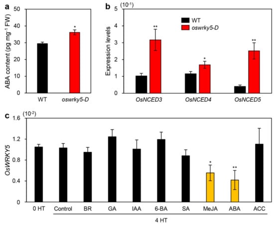 Four-week-old leaves of WT and oswrky5-D were pulverized in liquid nitrogen and then homogenized in 80% methanol containing 1 mM butylated hydroxytoluene as an antioxidant. Extracts incubated for 12 h at 4 °C were centrifuged at 4000× g for 20 min. The supernatant was passed through a Sep-Pak C18 cartridge (Waters, Milford, MA, USA) as described previously [], and the eluate was subjected to an enzyme-linked immunosorbent assay (ELISA) using an ABA ELISA kit (MyBioSource, San Diego, CA, USA) according to the manufacturer’s instructions.