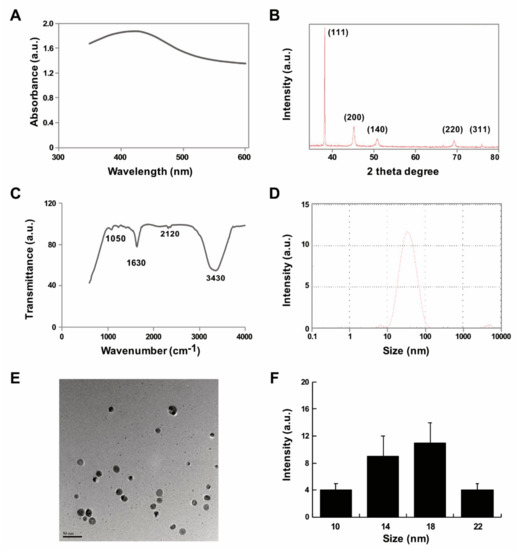 AgNPs synthesis was performed according to a previously described method [34]. Briefly, 1.0 mg/mL delphinidin was dissolved in methanol, AgNO3 was dissolved in water at a concentration 5 mM, and both delphinidin and AgNO3 were incubated at 40 °C for 6 h. Further characterization of the synthesized AgNPs was performed as previously described [123]. The bioreduction of silver ions was monitored spectrophotometrically between 300 and 600 nm. The reduced silver solution was sonicated for 10 min to separate silver nanomaterials from the biomolecules. After sonication, the solution was filtrated with a 0.2-µm syringe filter. The reduced silver metal was purified by repeated centrifugation at 15,000 rpm for 30 min and the pellets were washed with distilled water to remove the impurities. Purified AgNPs were characterized using various analytical techniques such as UV-vis spectroscopy, X-ray diffraction (XRD), Fourier transform infrared spectroscopy (FTIR), dynamic light scattering (DLS), and transmission electron microcopy (Tokyo, Japan).