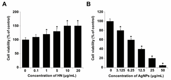 Dose-dependent effect of HN and AgNPs on cell viability of SH-SY5Y cells. (A) The viability of SH-SY5Y cells was determined after 24-h exposure to different concentrations of HN (0.1–20 µg/mL) (B) The viability of SH-SY5Y cells was determined after 24-h exposure to different concentrations of AgNPs (3.125–50 µg/mL). At least three independent experiments were performed for each sample. The results are expressed as the mean ± standard deviation of three independent experiments. Differences between the treated and control groups were measured using Student’s t-test. Statistically significant differences between the treated and control group are indicated by (* p < 0.05).