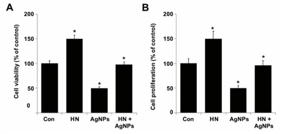 HN prevents AgNPs-induced reduction of cell viability and proliferation of SH-SY5Y cells. (A) SH-SY5Y cells were pretreated with or without 10 μg/mL HN for 24 h. Cells were then treated with 10 μg/mL HN and/or 10 μg/mL AgNPs for 24 h and then viability was measured using CCK-8 viability assay (B) SH-SY5Y cells were pretreated with or without 10 μg/mL HN for 24 h. Cells were then treated with 10 μg/mL HN and/or 10 μg/mL AgNPs for 24 h and then proliferation was measured using BrdU ELISA. At least three independent experiments were performed for each sample. The results are expressed as the mean ± standard deviation of three independent experiments. The treated groups showed statistically significant differences from the control group by the Student’s t-test (* p < 0.05).