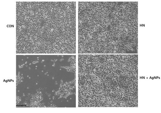 HN protects AgNPs-induced cell death. SH-SY5Y cells were pretreated with or without 10 μg/mL HN for 24 h. Cells were then treated with 10 μg/mL HN and/or 10 μg/mL AgNPs for 24 h. The cell morphology was determined using an optical microscope. Scale bar—200 µm
