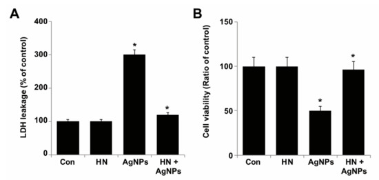 Effect of HN on AgNPs-induced leakage and dead-cell protease. (A) SH-SY5Y cells were pretreated with or without 10 μg/mL HN for 24 h. Cells were then treated with 10 μg/mL HN and/or 10 μg/mL AgNPs for 24 h, and the LDH activity was measured at 490 nm using the LDH cytotoxicity kit. (B) The level of dead-cell protease was determined by CytoTox-Glo cytotoxicity assay. The cell viability ratio was also determined according to the manufacturers’ instructions. At least three independent experiments were performed for each sample. The results are expressed as the mean ± standard deviation of three independent experiments. The treated groups showed statistically significant differences from the control group based on Student’s t-test (* p < 0.05).