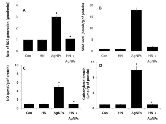2.7. HN Protects Against AgNPs-induced Rate of Reactive Oxygen Species (ROS) Production, Malondialdehyde (MDA), Nitric Oxide (NO) and Carbonylated Protein in SH-SY5Y Cells
