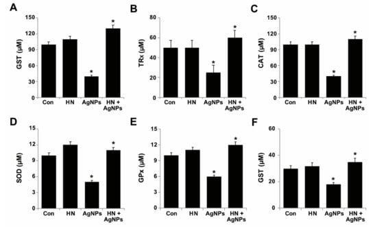 Effect of HN on AgNPs-induced reduction of antioxidant markers. SH-SY5Y cells were pretreated with or without 10 μg/mL HN for 24 h. Cells were then treated with 10 μg/mL HN and/or 10 μg/mL AgNPs for 24 h. After incubation, the cells were harvested and washed twice with an ice-cold phosphate-buffered saline solution. The cells were collected and disrupted by ultrasonication for 5 min on ice. (A) GSH concentration is expressed in micromoles. (B) TRX is expressed in micromoles. (C) Catalase concentration is expressed in micromoles (D) SOD is expressed in micromoles. (E) GPx concentration is expressed in micromoles. (F) GST concentration is expressed in micromoles. Results are expressed as mean ± standard deviation of three independent experiments. There was a significant difference in treated cells compared to untreated cells, Student’s t-test (* p < 0.05).