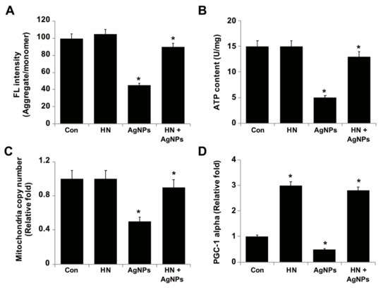 Mitochondria are the primary source of energy for cells to be able to drive various cellular functions properly and thus damage to mitochondria results in decreased level of energy production. Mitochondria are the vital source of ROS generation by AgNPs and HN is involved in AgNPs-mediated induction of toxicity [29,30,54,85,86]. Mitochondrial membrane polarization is essential for ATP production and maintains the calcium level. AgNPs induce loss of Δψm, which is involved in the dysfunctions of mitochondria. Although previous studies highlight the ability of AgNPs to induce mitochondrial dysfunctions, the biological significance of HN in protection of neuronal cells from AgNPs-induced mitochondrial dysfunction remains elusive. Therefore, we aimed to evaluate the mitochondrial membrane potential, ATP content, mitochondrial DNA copy number and mitochondrial biogenesis of SH-SY5Y cells. SH-SY5Y cells were treated with either HN or AgNPs (10 μg/mL) separately or with a combination of both HN and AgNPs (10 μg/mL + 10 μg/mL) for 24 h. The results showed that AgNPs significantly induced a loss of mitochondrial membrane potential up to 55% (2 ± 0.18) in comparison to the control (p < 0.05), whereas HN-pretreated cells rescued AgNPs-treated cells from the loss of MMP (Figure 9A). Similarly, HN prevented H2O2 induced loss of MMP in rat retinal cell cultures [74]. Jin et al. (2010) [58] had reported that pretreatment of PC12 cells with 100 nM HNG for 6 h prior to treatment with amyloid β (25–35) significantly stabilized the mitochondrial membrane potential, blocked cytochrome C release from mitochondria and thus maintained mitochondrial functions. Pretreatment of the neurons with HN (1 μmol/L) led to a significant increase of mitochondrial succinate dehydrogenase (SDH) activity and membrane potential [75].