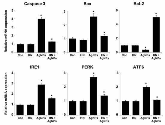 2.10. HN Inhibits AgNPs-induced Expression of Apoptotic, Antiapoptotic and ER Stress Sensors Genes