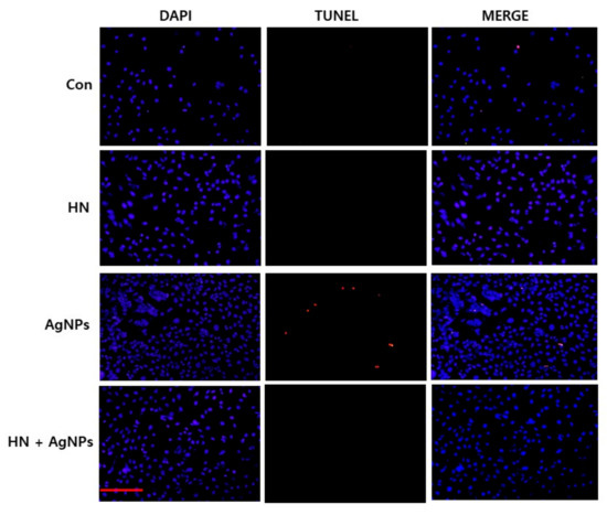 HN inhibits AgNPs-induced apoptosis. SH-SY5Y cells were pretreated with or without 10 μg/mL HN for 24 h. Cells were then treated with 10 μg/mL HN and/or 10 μg/mL AgNPs for 24 h. Apoptosis in SH-SY5Y cells after a 24-h treatment was assessed using the TUNEL assay; the nuclei were counterstained with DAPI. Representative images show apoptotic (fragmented) DNA (red staining) and the corresponding cell nuclei (blue staining). (Scale bar—100 µm)