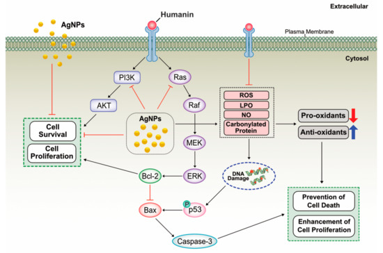 AgNPs are known to induce cell death through inhibition of cell viability and cell proliferation by the mechanism of inhibition of phosphorylation of cell survival kinase such as Akt, which is mainly involved in cell viability and cell proliferation. For example, AgNPs inhibit vascular endothelial growth factor (VEGF)-induced cell viability, cell proliferation, and migration by inhibition of phosphorylation of Akt in bovine retinal endothelial cells (BRECs) [110,111]. Based on our findings, the results suggest that HN could protect AgNPs-induced cell death by increasing cell viability and cell proliferation in human neuroblasoma cells. HN can function both in the extracellular and intracellular environments and it can bind and regulate a number of intracellular proteins, such as components of JAK2/ STAT3 pathway or an insulin-like growth factor binding protein 3 (IGFBP3) [112,113,114,115]. Several studies reported that HN can activate various signaling pathways such as JAK2-STAT3, p38mitogen-activatedprotein kinases MAPK P38MAPK), AMP-activated protein kinase (AMPK) and ERK1/2 and also c-JunN-terminalkinase (JNK) which are involved in cell proliferation and protect neuronal cells from apoptosis [116,117,118,119,120,121]. A recent study suggest that primary human fibroblasts exposed to HN modestly increased mitochondrial respiration and selected components of the senescence-associated secretory phenotypes (SASPs) in doxorubicin-induced senescent cells partially via the JAK pathway [122]. HN blocks pro-apoptotic Bax by prevention of its translocation from the cytosol into mitochondria and suppression of cytochrome C release [122]. Similarly, our findings also suggest that HN suppresses AgNPs-induced activation of Bax. Further, our studies demonstrated that HN blocks AgNPs-induced loss of viability and cell proliferation by mitigation of level of LDH, ROS, LPO, NO and also it increases the level of anti-oxidants and eventually leads to prevention of cell death. Based on our findings and previous studies, we proposed a model to describe activation /deactivation of various mechanistic pathways by HN in human neuroblastoma cells (Figure 13).