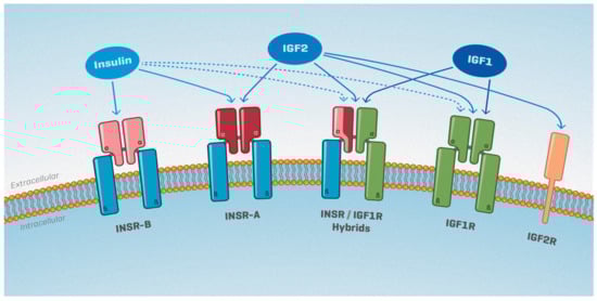- Frasca, F.; Pandini, G.; Scalia, P.; Sciacca, L.; Mineo, R.; Costantino, A.; Goldfine, I.D.; Belfiore, A.; Vigneri, R. Insulin receptor isoform A, a newly recognized, high-affinity insulin-like growth factor II receptor in fetal and cancer cells. Mol. Cell. Biol. 1999, 19, 3278–3288. [Google Scholar] [CrossRef]