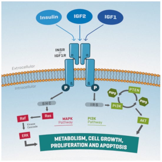 - Louvi, A.; Accili, D.; Efstratiadis, A. Growth-promoting interaction of IGF-II with the insulin receptor during mouse embryonic development. Dev. Biol. 1997, 189, 33–48. [Google Scholar] [CrossRef]