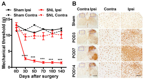 Taken together, these results demonstrate that we established a rat neuropathic pain SNL model showing pain behavior and microglial activity in the ipsilateral dorsal horn of the spinal cord.