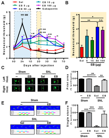 We then conducted the catwalk gait test, another sign of pain in SNL-treated rats (Figure 2C,D) [20]. In this assay, rats were randomly separated into four groups: the sham, the sham EB-treated group, the SNL saline-treated, and SNL EB (50 µg)-treated groups. Based on the results of the von Frey test, the catwalk test was performed on day 2 post-injection because the treatment of 50 µg EB reached the greatest effect. Figure 2C shows the representative images of the foot print areas of the right and left hind paws (contra and ipsi sides), illustrating the complete surface area of the hind paw once it touched the glass plate. In the sham group and the sham EB-treated group, we did not observe any significant difference in the print areas between the ipsi and contra hind paws. However, in the SNL saline-treated group, the print area of the ipsi high paw was much reduced in length and width, compared with the contra side. In the SNL EB-treated group, the print area of the left hind paw was enhanced, so the difference between the ipsi and contra sides was not significant. The quantitative data (Figure 2D) show the proportion of ipsi/contra foot print area, suggesting ratios of 42.0%, 86.02%, 100%, and almost 100% in the SNL saline-treated, SNL EB-treated, sham, and sham EB-treated groups, respectively. The print area was improved by 55% in the SNL EB-treated group, compared with the SNL saline-treated