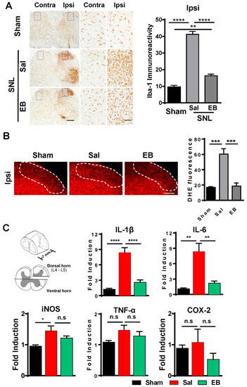 EB reduces SNL-induced microglial activation and decreases the generation of ROS and the gene expression of proinflammatory mediators in the ipsilateral dorsal horn of the spinal cord in rats with SNL-induced neuropathic pain. (A) Saline or EB (50 µg) were introduced by intrathecal injection on postoperative day 7. After two days, spinal cord sections (L5) were prepared and immunostained with anti-Iba1 antibody. The middle and right panels display the higher magnifications of the corresponding images in the purple dotted frames. Scale bars = 2 mm (left panel) and 400 µm (middle and right panel). Microglial reactivity was then measured in Iba1-immunoreactive cells using ImageJ software (version 1.50i. Java 1.6.0). Data are expressed as the mean ± SEM (one-way ANOVA with Tukey’s post hoc test, ** p < 0.01, **** p < 0.0001 vs. Sal; n = 3 per group). (B) Saline or EB (50 µg) were administered intrathecally on postoperative day 7. After two days, spinal sections (L5) of the sham, the SNL saline-treated and EB-treated rats were incubated with DHE (1 μM) for 5 min. The laminae I, II of the spinal dorsal horn are marked with white dotted frame. Scale bars = 200 µm (left panel) and 500 µm (right panel). The levels of ROS in the tissues were later obtained by measuring the intensity of DHE fluorescence using ImageJ software. Data are expressed as the mean ± SEM (unpaired Student’s t-test, t(4) = 5.636, *** p < 0.001 vs. Sal; n = 6 per group). (C) Saline or EB (50 µg) were introduced by intrathecal injection on postoperative day 7. After two days, the L4–5 fragments of the ipsilateral dorsal horn were prepared and used for total RNA isolation. The levels of proinflammatory mediators, including IL-1β, IL-6, TNF-α, iNOS, and COX-2, were evaluated with real-time qPCR. Sham was used as a control. Data are expressed as the mean ± SEM (one-way ANOVA with Tukey’s post hoc test, n = 5–7 per group: iNOS, * p < 0.05 vs. Sal; IL-1β, **** p < 0.0001 vs. Sal; IL-6, ** p < 0.01 vs. Sal). DHE, dihydroethidium; IL, interleukin; TNF, tumor necrosis factor; iNOS, inducible nitric oxide.